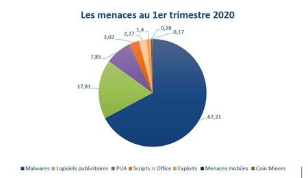 Au cours du premier trimestre 2020, les attaques étaient principalement des malwares, comme les chevaux de Troie, les vers et les file infectors. Ces trois types de malwares, ainsi que d’autres catégories, comme les rootkits et les dialers, représentent environ deux tiers des détections. Les applications potentiellement indésirables (PUA) et les logiciels publicitaires forment la grande catégorie suivante et représentent environ un quart des détections. Le reste est composé de scripts et de malwares basés sur Office, d’exploits, de menaces mobiles et de coin miners.