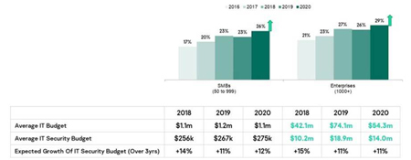 A titre de comparaison au niveau mondial en 2020, les petites et moyennes entreprises ont alloué 275 000 dollars à la cybersécurité en 2020, tandis que les grandes entreprises ont investi 14 millions de dollars (cf graphique ci-dessous).