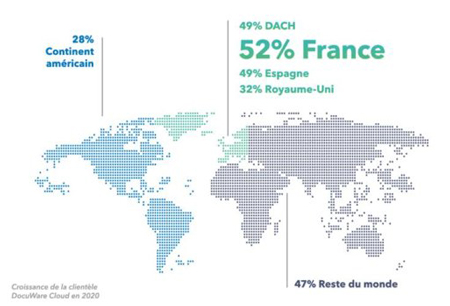 Cette hausse globale de la demande pour les solutions DocuWare Cloud prouve que le télétravail, la digitalisation et l’automatisation des processus dans la transformation numérique sont plus que jamais d’actualité. Par exemple, depuis le premier confinement en mars 2020, la France a connu la plus forte augmentation de clients DocuWare Cloud (plus de 50 %), suivie de près par l’Espagne et les pays germanophones (DACH) 49 %, puis par le Royaume-Uni (32 %) et le continent américain (28 %).