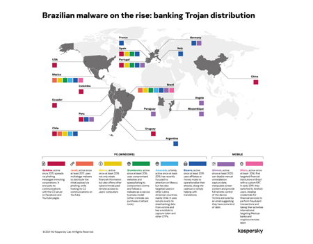 En 2020, les chercheurs Kaspersky ont constaté que quatre chevaux de Troie bancaires originaires d’Amérique du Sud (Guildma, Javali, Melcoz et Grandoreiro) avaient étendu leurs activités dans le monde entier. Cette famille de malwares, connue sous le nom de Tétrade, s’appuyait sur un ensemble de nouvelles techniques innovantes et sophistiquées. Une tendance qui s’est confirmée en 2021 puisqu’un nouvel acteur local, Bizarro, s’est propagé à l’échelle internationale.