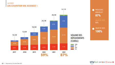 Fin 2022, l’objectif gouvernemental de 80% de couverture en fibre optique devrait être dépassé de 7% ! « Un satisfecit des acteurs de la filière qui peuvent se féliciter de réussir ce qu’aucun autre chantier d’infrastructure en France n’accomplit : être en avance ! » se réjouit Etienne Dugas, Président de la fédération.