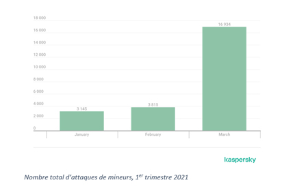 Cependant, selon les résultats du dernier rapport Kaspersky portant sur l’analyse des malwares au premier trimestre 2021, la situation a changé. En effet, de février à mars 2021, le nombre total de nouvelles modifications de mineurs a été multiplié par plus de quatre passant de 3 815 à 16 934. Au total, les chercheurs Kaspersky ont découvert plus de 23 894 nouvelles modifications de mineurs sur le premier trimestre de l’année 2021.
