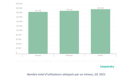 Le nombre d’utilisateurs Kaspersky ayant identifié des mineurs sur leurs outils a continuellement progressé passant de 187 746 en janvier à 200 045 en mars 2021. Au total 432 171 utilisateurs uniques ont été confrontés à des mineurs au premier trimestre 2021.