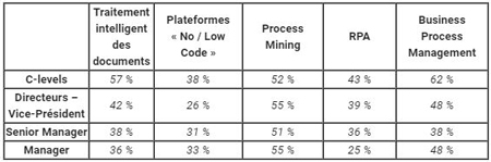 Ces investissements permettent notamment d’équiper les collaborateurs en technologies adéquates pour mener à bien ces projets. L’étude montre ainsi un faible investissement sur les citizen developers qui pourraient pourtant aider les entreprises françaises à prospérer : seulement 32 % d’entre elles utilisent des plateformes « No/Low Code ». Plus encourageant cependant, plus de la moitié (53 %) des entreprises françaises sont équipées en technologies de Process Mining.