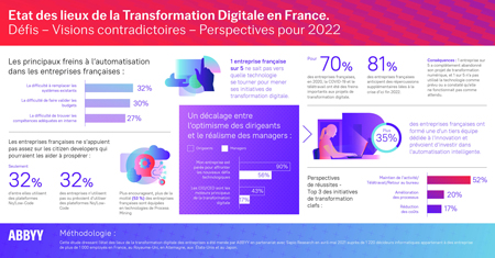 « La crise sanitaire et les changements profonds opérés sur le monde du travail démontrent toute l’importance d’une transformation digitale réussie et maitrisée par l’ensemble des travailleurs. Le décalage entre la perception des dirigeants et des managers est l’un des freins les plus importants aux projets de digitalisation en entreprise, notamment dans un contexte où l’incertitude et le besoin d’innover est de plus en plus présents. Pour mener à bien cette transformation profonde des processus et de notre façon de travailler, les entreprises doivent prendre conscience de l’importance des technologies d’automatisation. Il est ainsi primordial de choisir le bon accompagnement pour assurer une implémentation parfaite et un usage approprié de ces nouveaux outils. », souligne Linda Ameur, directrice France d’ABBYY.