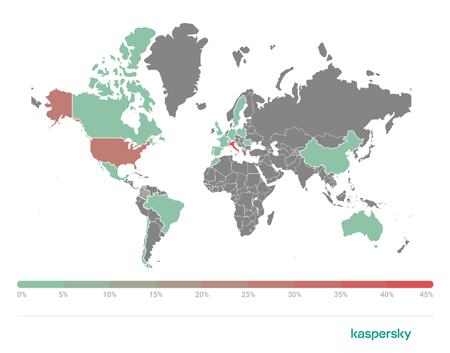 En utilisant son service de Threat Intelligence, Kasersky a observé plus de 5000 tentatives d’attaques dans 22 pays, dont les plus touchés sont l’Italie (45,2% des tentatives d’attaques enregistrées), les USA (25,91%), la Colombie (14,83%), l’Allemagne (3,21%) et le Mexique (2,21%)