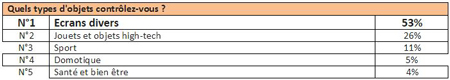 Avec leur smartphone, 53% des utilisateurs apprécient de pouvoir naviguer sur plusieurs écrans comme ceux des TV, des ordinateurs ou des tablettes. Les jouets et les objets high-tech arrivent en deuxième position avec 26% d’adeptes, juste devant les applications dédiées au sport. Enfin, la domotique ne séduit à l’heure actuelle que 5% des possesseurs de smartphone à égalité avec l’univers de la santé et du bien-être.
