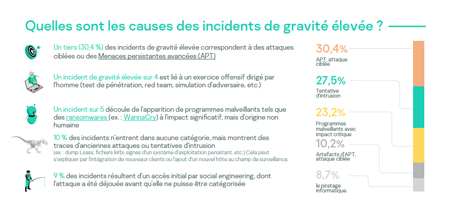Près d’un tiers (30 %) de ces incidents critiques sont le fait d’attaques ciblées perpétrées par des hackers. Près d’un quart (23 %) de ces incidents critiques ont été classés dans la catégorie des malwares à fort impact, qui incluent les ransomware. Dans 9 % des cas, les hackers ont pu accéder au parc informatique de l’entreprise grâce à des techniques d’ingénierie sociale.