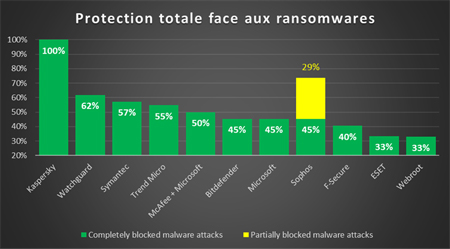 Niveau de protection des différents produits face aux ransomwares. « Entièrement bloqués » signifie que les ransomwares ont été détectés, et que tous les fichiers ont été protégés. « Partiellement bloqués » signifie que les ransomwares ont été détectés, mais que certains fichiers ont été perdus.
