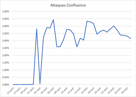 En analysant les données allant de la fin du mois d’août à la fin du mois de septembre, les chercheurs de Barracuda ont constaté que les attaques ciblant la vulnérabilité Confluence avaient connu un pic pour ensuite se maintenir à un niveau élevé, car de nombreux utilisateurs de Confluence continuaient à utiliser une version vulnérable du logiciel.
