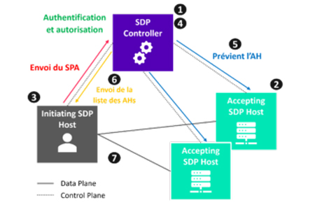 SDP Controller : appareil ou processus sécurisant l’accès au service isolé en s’assurant que les utilisateurs sont authentifiés et autorisés à accéder au service avec un terminal validé. Il force aussi l’application de politiques supplémentaires pour que les communications établies soient sécurisées.