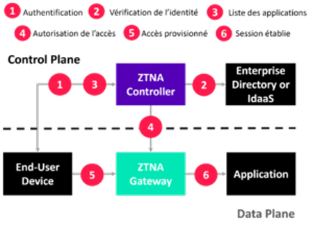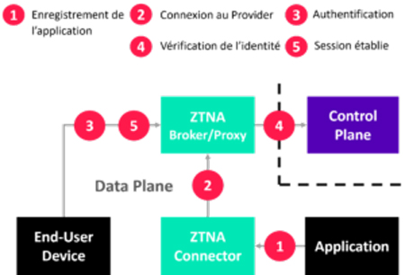 Ce modèle s’inspire du Software-Defined Perimeter où le ZTNA Controller correspond au SDP Controller. Dans un premier temps, l’utilisateur va s’authentifier auprès du ZTNA Controller qui va vérifier son identité et celle du terminal utilisé. Le ZTNA Controller renvoie ensuite la liste des applications auxquelles l’utilisateur est autorisé à accéder. Il prévient ensuite la ZTNA Gateway que cette paire utilisateur-terminal est autorisée à accéder à la ressource.