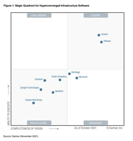 Nutanix un leader du cloud computing dans les environnements privés, hybride et multicloud, a été reconnu par le cabinet d’études Gartner comme un Leader dans son Magic Quadrant for Hyperconverged Infrastructure Software de novembre 2021 pour la cinquième année consécutive. Nutanix a été distingué pour les capacités de son logiciel d’infrastructure hyperconvergée. Nutanix estime que sa reconnaissance continue en tant que leader peut être attribuée aux capacités étendues et améliorées de sa plateforme HCI, ainsi qu’à son support client qui a obtenu une moyenne de 90 Net Promoter Score (NPS) au cours des sept dernières années.