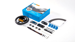 2. Un coffret d’extension automobile comprenant un volant télécommandé Cyber Pi (avec batterie), une piste de circulation et le cahier de questions et réponses