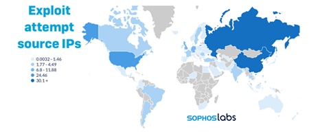 Toutefois, la provenance de ces tentatives se situe principalement en Chine et en Russie, la majorité de ces tentatives étant liées à la cybercriminalité. Un serveur en Russie, connecté à Kinsing, un botnet de minage de cryptomonnaie, est responsable de plus de 10 % des tentatives d’exploit que Sophos a observées, soit plus de 33 % du trafic provenant de ce pays."