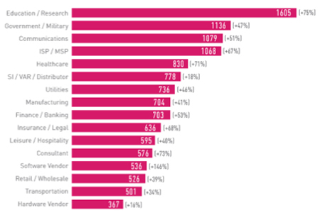 L’éducation et la recherche ont été les secteurs les plus ciblés, puisque les organisations se sont retrouvées confrontées à une moyenne de 1 605 attaques hebdomadaires.