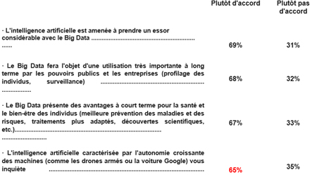 Deux points méritent d’être soulignés dans les résultats obtenus à ce sondage. Premièrement, il existe un bon accord dans les résultats aux différentes questions posées (65 à 69 %). Ainsi, deux tiers des participants considèrent que l’intelligence artificielle est amenée à prendre un essor considérable avec le Big Data, et que celui-ci fera l’objet d’une utilisation très importante par les pouvoirs publics et les entreprises. Pour les personnes sondées, le Big Data présente des avantages ; il est considéré comme un facteur de progrès, notamment pour la recherche scientifique, la prévention et le traitement des maladies. En même temps, l’intelligence artificielle inquiète, en particulier avec l’autonomie croissante des machines.