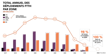 Toutefois, le périmètre de déploiement continuant de grossir (l’estimation à 2025 table maintenant sur 44 millions), la ligne d’arrivée se décale sans pour autant remettre en cause le respect des engagements. 2023, qui devait amorcer une baisse significative des déploiements, restera donc une année de construction intense avec 4,8 millions de prises. Les déploiements de la période 2021-2023 étant majoritairement réalisés en zones RIP.