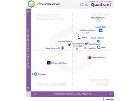 Le rapport de SoftwareReviews sur l’architecture d’enterprise classe les éditeurs de logiciels sur la base des avis des clients. L’authenticité des données est vérifiée et elles sont comparées afin de donner une vue globale des outils du marché. Cette étude calcule aussi une « empreinte émotionnelle », qui résulte d’une évaluation à caractère subjectif sur différents aspects : service, négociation, impact du produit, résolution des conflits, stratégie et innovation. Cela crée un indicateur du sentiment général des utilisateurs vis-à-vis des éditeurs de logiciel et de leurs produits.