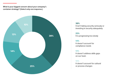 Les montants investis ne sont pas à la hauteur du taux d’adoption Au cours des dernières années, la sécurité est demeurée l’un des principaux sujets de préoccupation dans le domaine de l’adoption de la technologie de conteneurs. L’étude menée cette année ne vient pas démentir cette tendance. En effet, 38 % des répondants déclarent que la question de la sécurité n’est pas suffisamment prise au sérieux ou que les montants investis dans ce domaine sont inadaptés aux besoins ce qui représente une hausse de 7 % par rapport à l’année dernière. Il est également intéressant de noter que les investissements dans le domaine de la sécurité n’ont pas nécessairement augmenté à mesure que le taux d’adoption continuait de croître.