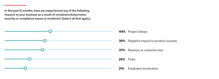 Par ailleurs, 37 % des répondants mentionnent la perte de revenus ou de clientèle comme l’une des conséquences d’incidents de sécurité liés à un conteneur ou à Kubernetes. Ces incidents peuvent induire des retards dans des projets essentiels ou des lancements de produits, tandis que les entreprises sont forcées de concentrer en priorité leurs efforts sur la sécurité afin de pallier des vulnérabilités qui n’ont pas été détectées lors de la phase de développement. Ces retards peuvent avoir un effet boule de neige sur l’activité de l’entreprise, se traduisant alors par une baisse du chiffre d’affaires encore plus importante, des clients insatisfaits ou encore la perte de parts de marchés au profit de la concurrence. Ces types d’incidents peuvent également éroder la confiance des clients dans la capacité de l’entreprise à protéger des données confidentielles, ce qui peut alors conduire purement et simplement à une perte de clientèle.