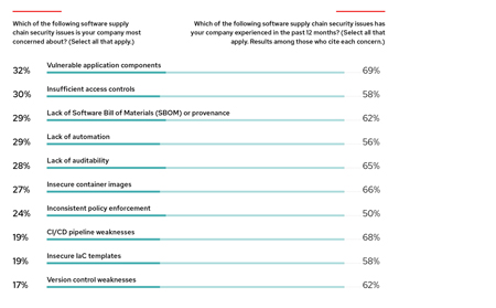 Les conclusions de l’enquête correspondent à ce qu’il est logique d’attendre de chaînes d’approvisionnement logicielles typiques au sein d’un environnement conteneurisé. Les trois principaux motifs d’inquiétude mentionnés sont les composants d’applications vulnérables (32 %), les contrôles d’accès insuffisants (30 %) et une absence de nomenclature (SBOM) ou de documentation attestant de l’origine des logiciels (29 %).