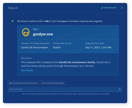Ruby étend Rubrik Security Cloud avec l’IA générative et l’automatisation. Ruby aide les clients de tous les niveaux d’expertise en cyber sécurité grâce à un processus de réponse guidée qui permet aux clients d’explorer, de comprendre et de répondre à un incident dans le but de reprendre plus rapidement les opérations critiques de l’entreprise.