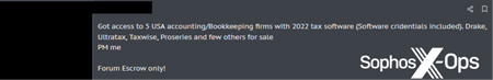 Découvert par l’équipe Sophos X-Ops sur un forum du dark web, ce message annonce l’accès à des cabinets comptables américains. D’autres exemples d’annonces publiées sur des forums cybercriminels et visant des PME par secteur d’activité et par pays sont présentés dans le 2024 Sophos Threat Report.