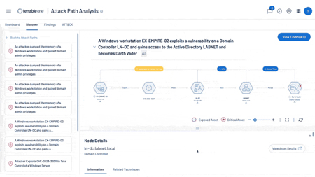 Assistant IA : il permet de poser des questions spécifiques sur le chemin d’attaque résumé à l’assistant IA de Tenable, ainsi que sur chaque nœud situé le long du chemin. Ces questions comprennent des demandes d’informations sur un asset donné, le nombre d’administrateurs de domaine y ayant accès, le correctif pouvant être appliqué pour atténuer une vulnérabilité d’un chemin d’attaque et le nombre de chemins d’attaque que ce correctif atténue.