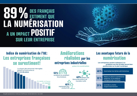 La majorité des entreprises industrielles françaises profitent déjà largement des projets de numérisation. Mais la pénurie de main-d’œuvre continue d’entraver durablement ces projets. Les industriels français surestiment-ils leur numérisation et, plus généralement, celle de leur pays ? Une étude menée par OnePoll pour Reichelt Elektronik auprès de 250 entreprises industrielles françaises propose un examen de l’état actuel de la numérisation en France.