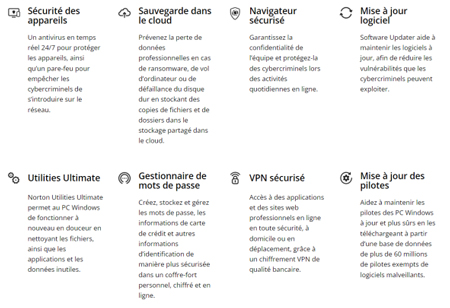 Norton Small Business qui intègre la Sécurité des appareils, le Navigateur sécurisé, la Mise à jour logicielle, l’Utilities Ultimate, le Gestionnaire de mots de passe et la Sauvegarde cloud de 250 Go pour PC