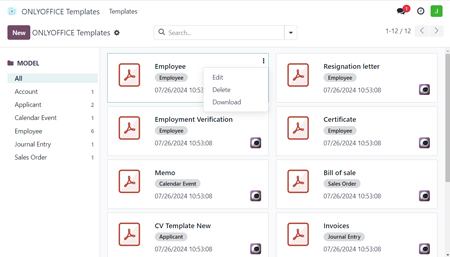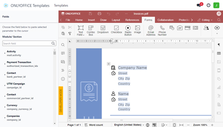 La nouvelle application ONLYOFFICE est conçue pour ajouter des données d’Odoo à des documents de la manière la plus simple et la plus rapide. Les utilisateurs peuvent créer un modèle directement dans Odoo et l’utiliser ensuite pour remplir les PDF avec toutes les données pertinentes.