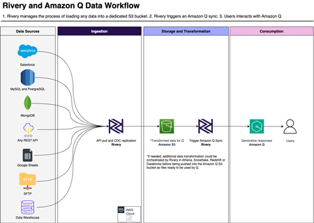 Avec les 200+ intégrations de données de Rivery et une simplicité de mise en place en moins de 10 minutes, tous types et tailles d’entreprises peuvent installer Amazon Q. Pour garder Amazon Q à jour avec les dernières données, Rivery peut être utilisé pour automatiser le processus de synchronisation et garder l’assistant alimenté en données continuellement.