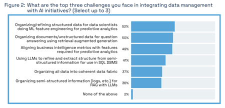 Pour près de la moitié des sondés (52 %), l’un des principaux défis à relever pour intégrer la gestion des données à leur initiatives IA est l’organisation et l’affinement des données structurées pour les fonctionnalités de machine learning. 50 % éprouvent également des difficultés à organiser les données non structurées pour la génération de recherche augmentée (RAG).
