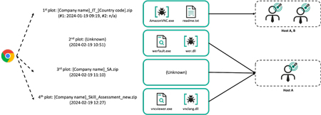 En l’espace d’un mois, au moins deux salariés appartenant à la même entreprise ont été ciblés par Lazarus, recevant de multiples fichiers d’archives maquillés en évaluations de compétences pour des postes informatiques au sein d’entreprises stratégiques du secteur de l’aérospatiale et de la défense. Lazarus a d’abord livré la première archive aux hôtes A et B au sein de la même organisation, puis, après un mois, a lancé des attaques plus agressives contre la première cible. Ils ont certainement utilisé des réseaux sociaux professionnels tels que LinkedIn pour transmettre les instructions initiales et accéder aux cibles.