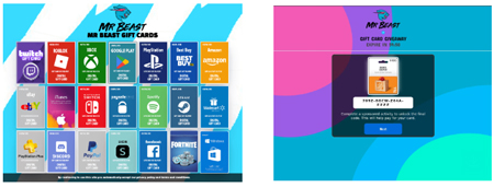Une autre découverte des chercheurs de Kaspersky concerne des escroqueries exploitant le nom de MrBeast, un YouTubeur très célèbre auprès des enfants et des adolescents, connu pour ses divers jeux concours aux prix onéreux. Dans ce cas, les cybercriminels ont créé des pages d’hameçonnage promettant des « cadeaux gratuits de MrBeast », notamment des cartes-cadeaux numériques pour des plateformes telles que Roblox, Xbox et PlayStation. Le site invite les utilisateurs à choisir le prix qui les intéresse le plus, suivi d’un appel à l’action pour maximiser leurs chances. Pour accroître le sentiment d’urgence, un compte à rebours s’affiche sur la page, invitant les visiteurs à « réaliser une activité sponsorisée » dans un délai limité pour débloquer un code permettant d’accéder à la récompense finale.
