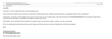 Au-delà du phishing, les PME sont inondées de spams. Sans surprise, l’IA a infiltré les courriers indésirables, avec par exemple des offres d’automatisation de divers processus métier.