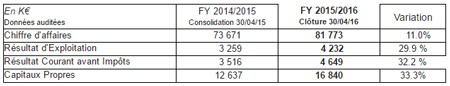 L’exercice se singularisant par l’absorption du Groupe OCEALIS, les comptes annuels regroupent désormais un périmètre plus large que ceux établis au titre de l’exercice clos le 30 avril 2015. Les principales données chiffrées de l’exercice 2015/2016 (du 1er mai 2015 au 30 avril 2016), présentés à isopérimètre, à savoir en comparaison de la consolidation effectuée au titre du précédent exercice, sont les suivantes :