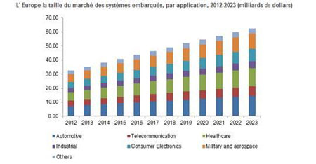 Le marché des systèmes embarqués a été évalué à plus de 144 milliards de dollars en 2014 et devrait observer des gains importants, avec une prévision de 240 milliards de dollars en 2023 avec un taux de croissance de plus de 5,5% de 2016 à 2023. L’innovation technologique et le progrès dans les pays émergents tels que la Russie, l’Inde, la Chine, Brésil et Taiwan est susceptible de stimuler la croissance.