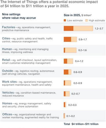Concernant la complémentarité des réseaux, l’Idate est sûr que des réseaux comme LoRa et Sigfox ne seront pas concurrents mais complémentaires. Les LPWA sont d’ailleurs en forte croissance. Le seul risque est la concurrence qui pourrait se créer entre ces réseaux et les opérateurs traditionnels. Mais il n’existe aucune guerre réelle à l’heure actuelle entre ces technologies. Un enjeu majeur va être de développer un ensemble de technologies qui proposent des solutions, encore une fois, complémentaires. Mc Kinsey & Company estime que l’internet des objets pour les industries occupera 70 % du marché total. Un investissement que le cabinet estime entre 4 et 11 milliards de dollars en 2025 mais qui générera deux fois plus de revenus que le marché grand public.