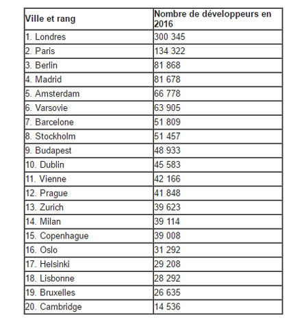 Plus d’un demi-million (516 535) d’entre eux travaillent à Londres, Paris et Berlin. La région de Londres, qui comporte 300 345 développeurs, figure en tête du classement. Paris occupe la deuxième position avec plus de 130 000 développeurs.