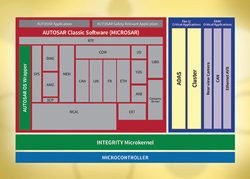 La dernière génération d’unités de commande électroniques nécessite de plus en plus de puissance de calcul et de mémoire. D’où le fréquent besoin d’une gestion dynamique de la mémoire pour les nouveaux domaines d’application. Les récentes architectures automobiles imposent en effet des ECU bien établies, avec des OS AUTOSAR éprouvés, qui viennent souvent compléter des systèmes sophistiqués gourmands en puissance de microprocesseur. Pour répondre à ce besoin, bien des systèmes utilisent deux microprocesseurs séparés qui exécutent MICROSAR et INTEGRITY en parallèle. Grâce à la récente prise en charge de MICROSAR par Green Hills Software, le RTOS INTEGRITY (certifié ISO 26262 et IEC 61508) et MICROSAR peuvent désormais être intégrés sans faille de façon à utiliser un même contrôleur pour réduire les coûts système.
