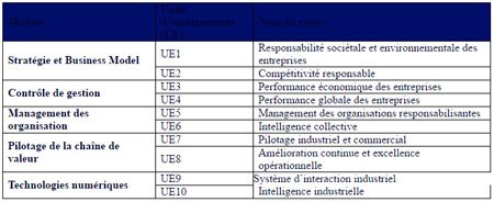 La formation est divisée en 5 blocs de compétences de 70 heures chacun, associés aÌ des thématiques spécifiques, soit un total de 10 unités d’enseignement (UE). Chaque module est constitué de 2 unités d’enseignement de trente-cinq heures chacune et comprenant des enseignements théoriques, des travaux pratiques et des projets personnels. Les 350 heures d’enseignement sont suivies d’une période de stage en entreprise de quatre mois minimum, qui donne lieu aÌ la soutenance d’une thèse professionnelle.
