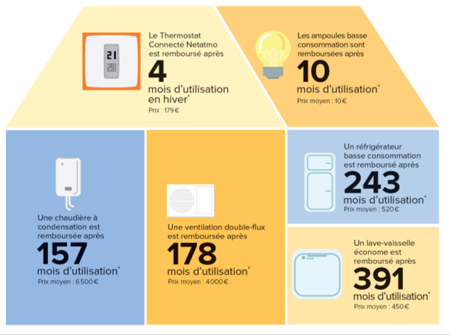 Parmi les solutions faciles à installer soi-même, le Thermostat Connecté Netatmo est rentabilisé très rapidement. En seulement quatre mois de chauffage en moyenne, l’utilisateur rembourse son thermostat grâce aux économies réalisées, contre onze mois d’utilisation pour une ampoule à faible consommation ou 391 mois d’utilisation pour un lave-vaisselle à faible consommation.