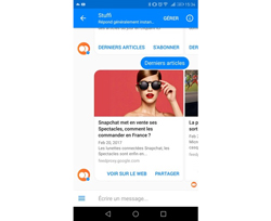 Le StuffiBot permet de connaître les dernières actualités dans les domaines suivant : drones, montres connectées, bracelets connectés, domotique, etc.. Il permet d’accéder aux derniers articles en un seul clic, via des mots clés, des recherches, et la possibilité de les partager avec ses amis sans quitter l’application Facebook.