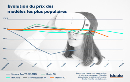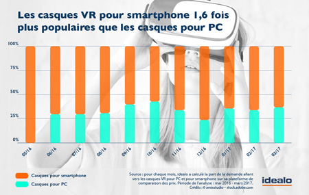 En juin 2016, les premiers effets de la commercialisation du HTC Vive ont été perçus : le casque pour PC a alors engrangé 30 % de la demande sur idealo. Ce chiffre a ensuite stagné pour passer à 40 % en octobre 2016. L’augmentation de l’intérêt pour les casques PC est notamment due à la sortie de l’Oculus Rift. Depuis, la part des casques de VR pour PC oscille entre 24 et 34 % et la majorité des consommateurs s’orientent vers les modèles utilisables avec un smartphone..
