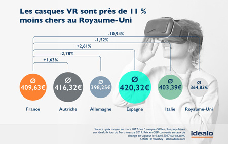 A l’occasion de la mise-à-jour du logiciel Windows 10 « Creators Update » du 11 avril, dont l’utilisation se destine également aux utilisateurs de casques de réalité virtuelle, idealo, le comparateur de prix du groupe Axel Springer, a choisi de s’intéresser au sujet des casques VR. Quel est le prix moyen d’un casque de réalité virtuelle en fonction des pays d’Europe ? Comment ont évolué leur popularité depuis fin 2015 et la sortie du Samsung Gear VR et leurs prix ont-ils réellement baissé ? Quelle est la part des casques pour smartphone par rapport à celle des casques pour PC dans les ventes totales ? Bien que les prix affichent une tendance à la baisse, c’est au Royaume-Uni que le marché du casque de réalité virtuelle est le plus attractif.