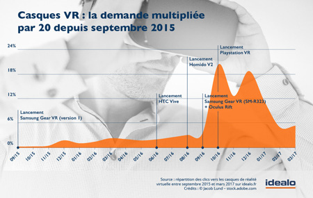 L’arrivée d’autres modèles lors du deuxième semestre 2016 comme le Homido V2, le Samsung Gear VR (SM-R323) ou encore le casque PlayStation VR compatible avec la PS4 ont engendré un boom de la demande. Alors que la demande s’élevait à 24 % entre septembre 2015 et septembre 2016 et stagnait mois par mois autour de 1 à 3 %, elle a pris son envol en octobre 2016. Durant ce mois record, un pic de la demande de 21 % a été enregistré, soit presque autant que lors des 12 mois précédents.. Dans l’ensemble, le dernier trimestre 2016 a été un succès pour le marché de la réalité virtuelle puisque 44 % de la demande se sont concentrés sur cette période. Après les fêtes de fin d’année et la période des soldes, la demande est redescendue à environ 5 % par mois, chiffre qui peut paraître bas mais qui est tout de même 20 fois plus élevé qu’en septembre 2015 et 2 fois plus élevé qu’en mars 2016.