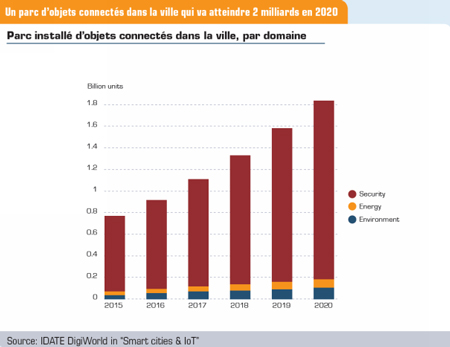 IDATE DigiWorld estime à plus de 2 milliards le nombre d’objets connectés déployés d’ici cinq ans dans les villes, pour répondre aux besoins en mobilité, environnement, sécurité publique et gestion des flux, offrant ainsi de réelles opportunités pour le développement de services urbains innovants.