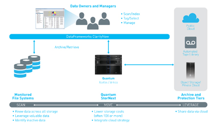 La combinaison des appliances de stockage en mode « scale-out » de Quantum et de ClarityNow de DataFrameworks est un moyen pour les propriétaires de données, tels que les responsables de projet, chercheurs principaux, ingénieurs en chef et chercheurs, de consulter l’archive et d’y effectuer des recherches sans faire appel au département informatique. La solution libère ainsi la pression exercée sur des ressources informatiques limitées. Dans la plupart des cas, elle divise par dix, si ce n’est plus, les coûts d’exploitation et d’investissement liés à la gestion de vastes quantités de données en mode fichier au sein d’environnements de stockage complexes.
